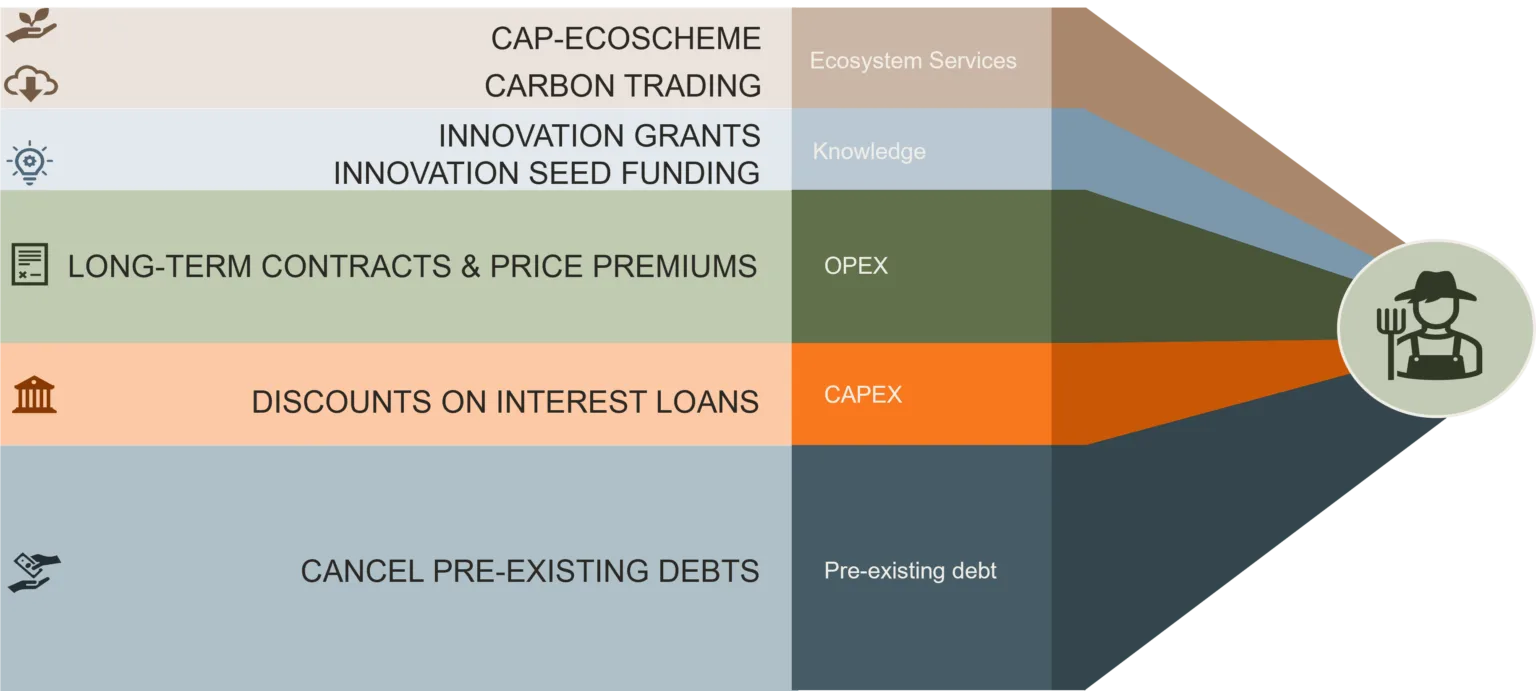 Để tài trợ và đẩy nhanh quá trình chuyển đổi, Châu Âu cần các cơ chế hỗ trợ tài chính toàn diện và toàn diện hơn có thể mở rộng để tiếp cận nhiều nông dân. Sự phức tạp của hỗn hợp trợ cấp, cho vay, phí bảo hiểm và bảo hiểm hiện tại tạo ra rào cản đáng kể đối với việc áp dụng rộng rãi. Một bối cảnh tài chính đơn giản hóa với các gói tài chính công-tư tích hợp là điều cần thiết để hỗ trợ nông dân trong quá trình chuyển đổi sang các mục tiêu nông nghiệp tái tạo.