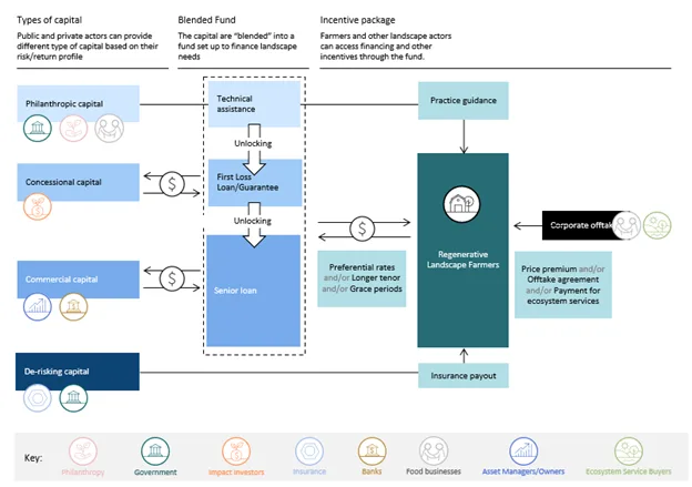 Vốn hỗ trợ nông dân với tư vấn nông học thường được cung cấp bởi vốn từ thiện. Với nguồn tài chính ưu đãi để giảm thiểu rủi ro thua lỗ sớm tiềm ẩn trong quá trình chuyển đổi, các mô hình tài chính hỗn hợp giúp các khoản đầu tư vào quá trình chuyển đổi cảnh quan trở nên hấp dẫn đối với các nhà đầu tư tư nhân. Với hai nguồn tài trợ này, các nhà cung cấp vốn thương mại có thể cung cấp cho nông dân lãi suất thấp hơn, thời hạn dài hơn và/hoặc thời gian ân hạn khi trả nợ.