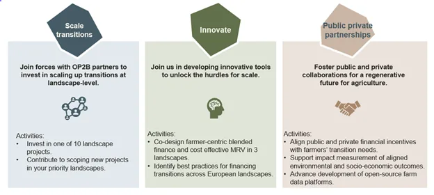 Hợp tác cảnh quan nằm ở cốt lõi của quá trình chuyển đổi nông nghiệp. OP2B hướng đến mục tiêu trở thành trung tâm kích hoạt cho các hoạt động hợp tác giữa các sáng kiến cảnh quan, nông dân, ngành công nghiệp, chính sách và tài chính để mở rộng quy mô các dự án cảnh quan. Vào năm 2025, điều này sẽ hình thành thông qua việc mở rộng quy mô chuyển đổi, đổi mới và tạo ra quan hệ đối tác công tư.